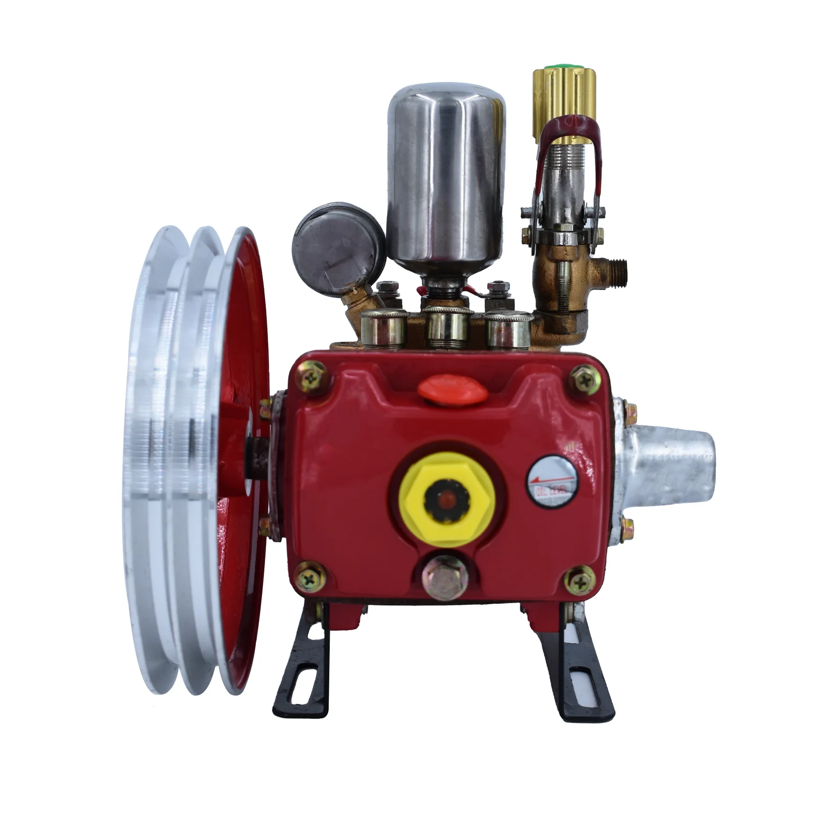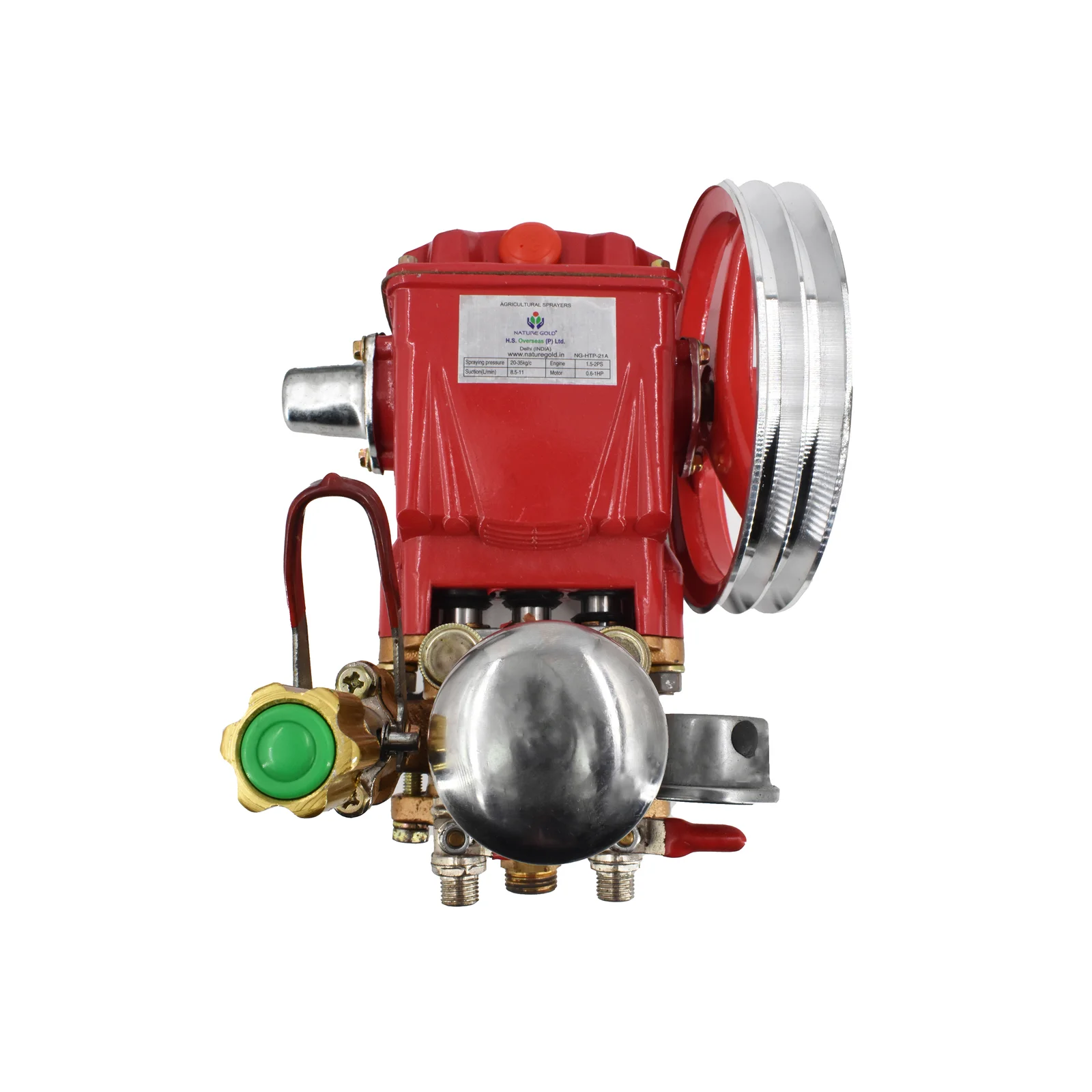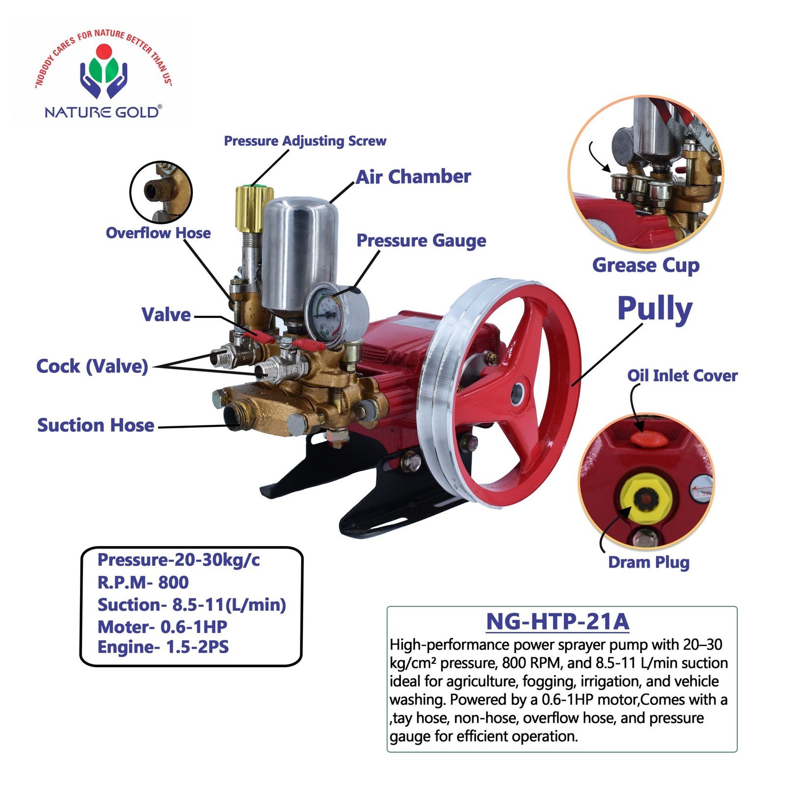 This high performance power sprayer pump with 20-30 kg/cm² Pressure, 800 RPM, 8.5-11 (l/min) Suction ideal for agriculture, fogging, irrigation, and vehicle washing. Powered by a 0.6-1HP motor. Comes with a tay hose, non-hose, overflow hose, pressure gauge, and efficient operation.