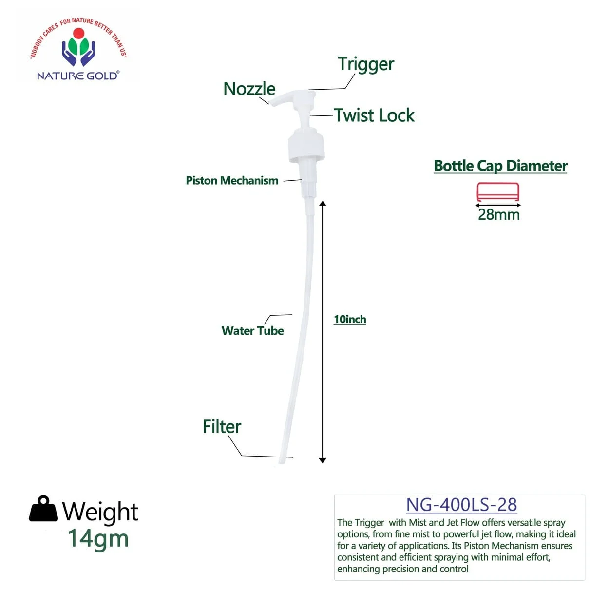 Sprayer dip tube NG-400LS-28(trans.) is designed with Mist and Jet flow which offers versatile spray options, from fine Mist to powerful Jet flow, making it an ideal product for a variety of tools. Its Piston mechanism ensures consistent and efficient spraying with minimal effort enhancing precision and control. Perfect Gardening solutions for applying water or pesticides. Mostly used in agriculture to control mildews, rusts, blights, and fungi.